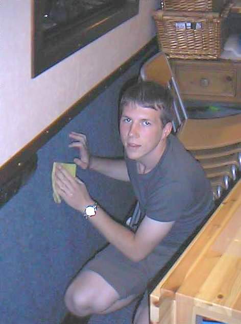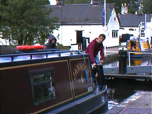 Met up with nb Florence Rose ( see Kennet & Avon 2001 ) at the water point. Caught up on 1 year's gossip, they'd sold their house, Simon had got his A levels etc. Met some people at Tyreley locks, who required a demonstration of Dad's new workhorse motorbike ( the Flying Flea or Fleeing Fly) as they wanted to buy one. 5 locks without hassle, as we'd lost the drunken hen party who were behind us, and then a thin cutting where boats had trouble passing. When the polishing and painting was completed, the boat was emptied of breakables/edibles ready for the NEXT CREW! (yay, them) Simon's double entry book-keeping course (the BW expenses logbook!!) completed- earning him a headache. |