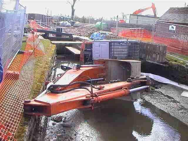 The works at Claydon locks were extended due to a visit to the site by a bunch of Yobs. The picture on the left gives some idea of the state they left the middle lock in. They damaged the lock gates and the little lockside building and then dumped the digger in the cut. |