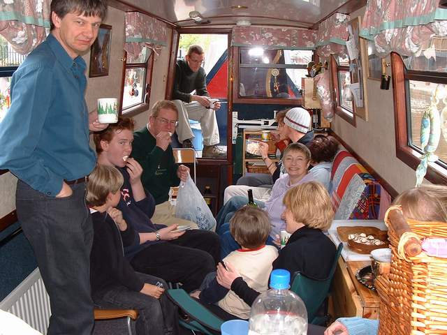 The second 18th birthday celebrated with good food and good company aboard Jannock. Guests came bearing gifts of home made cake, so Richard, Maureen, Judith, David, Joshua, Luke, Carly and Alain were force fed cake, tea and alcoholic libations too. Matt and Rosie shared a 17th/18th birthday cake, but managed not to sing! We met all the newly hired boats going North as we took a 'demonstration cruise' through town lock and down to the winding hole. Lesley, an experienced hand, melded into the crew. We then banqueted on Thai food and went to bed bloated. Happy Easter. |