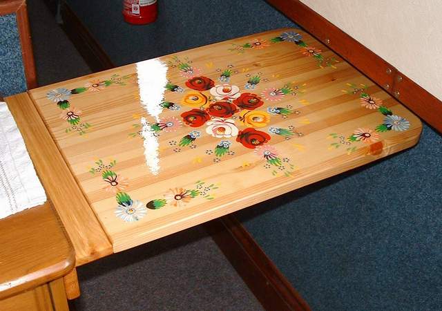 We were runnning late and so we decided to eat aboard and use the extra time to fit the new flip-up table in the kitchen/lounge area - thanks to Judy & Stan of nb Blue Heron, via the GiG charity auction and Terry for decorating it. Whilst I prepared tinned surprise - Graham did a "Cap'n Beeky" and stood on a bit of the bank that was not actually there - getting a very wet leg. |