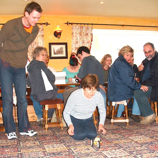 Saturday morning continued the exercise theme; we walked around Stockton fishing lake in lovely sunshine. After lunch we installed ourselves in the function room for Graham's Lego-Egg-Race. An interesting afternoon, spent with Lego, elastic bands, hardboiled eggs, a crossword puzzle and origami duck making. Good fun, yes, really. |