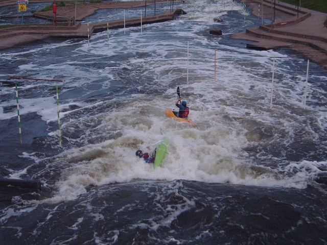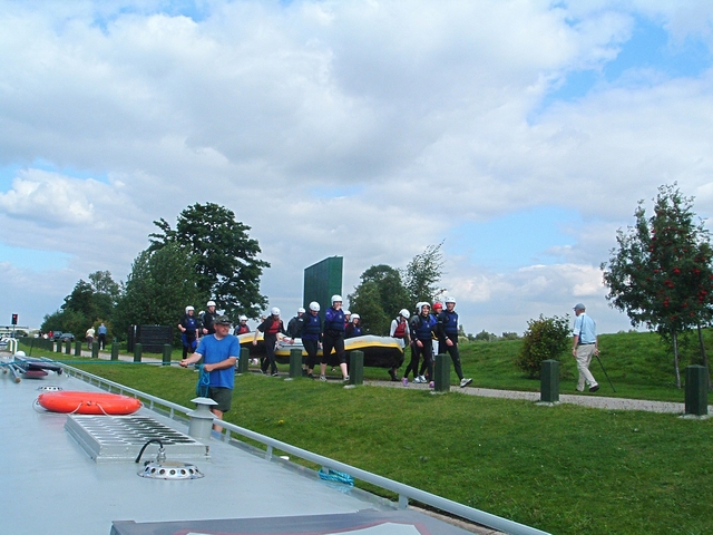 We alternated between river and canal all day. The river sections have been beautiful and teeming with wildlfe, and domesticated life, at the water's edge. It's been like the Thames but without the gin palaces or the volume of traffic. At Nottingham we saw a riverboat wedding party, and raised our glasses to the happy couple. All those stiletto heels looked a liability as the boat rocked. We enjoyed a quick glimpse of the loonies at the National Watersports centre, all teeny boats, RIBs and getting drenched. We refuelled for tums at Sainsbury's, next to Castle marina and took our goods to a mooring on the Trent. We enjoyed Poulet sur Pontoon for supper. |