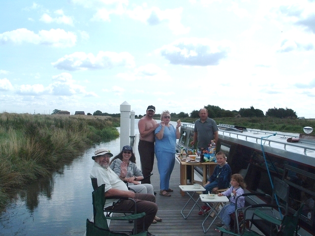 Brenda : Wow, posh or what? Luncheon al fresco tied up to a pontoon which wasn't on the charts. Very quiet and peaceful, we had it to ourselves. (We took Jannock's dining table out onto the pontoon so that we could all sit comfortably and, in the case of the children, safely leaving no gap twixt seats and boat side, securely close-moored to the pontoon.) We even had a table decoration in the form of beautiful orchids. A few boats cruised past, none dining as well as us. Loads of bird and fish life around. The children, big and little ones, went kite flying at the side of the river. |