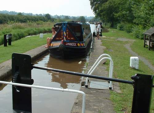 water. A working boat was coming up through the next lock towing an unpowered steel cruiser. The steerer of said cruiser had little directional control and Jannock