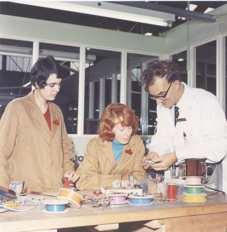 Although Pam and Sandy were 1969, not 1970 intake apprentices, they were going through 'E' shed during our first year there. This (staged) picture shows them being instructed by George Webb. |