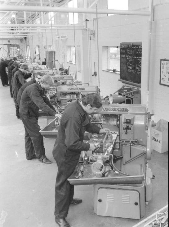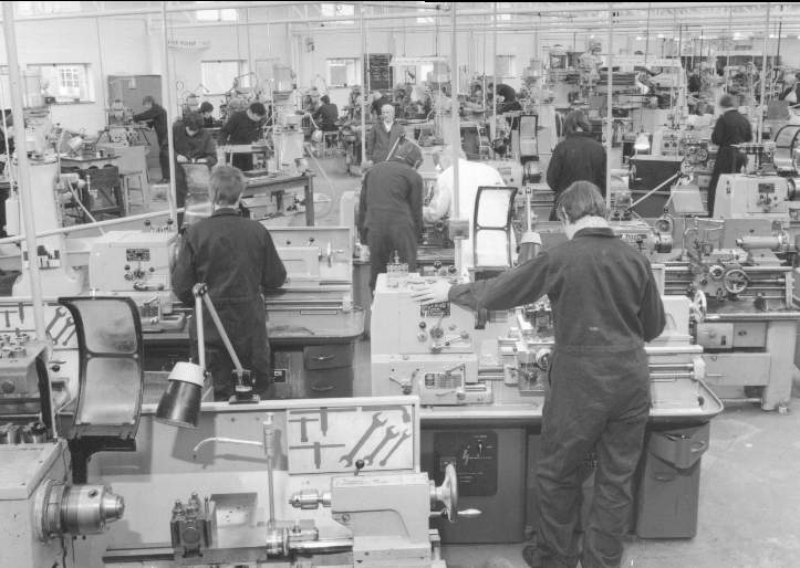 A view inside P68 (the Trog Shop) showing enthusiastic blue clad apprentices using the lathes. Interesting to note the 'shadow board' on the nearest lathe is completely devoid of tools! |